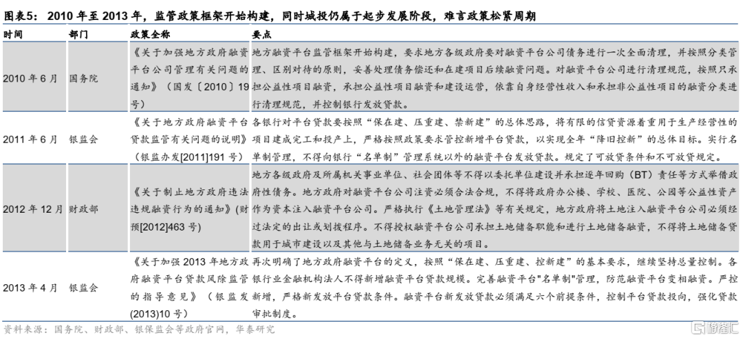 前序阶段:2010-2013年,监管框架构建期,城投平台起步发展,难言政策松紧;