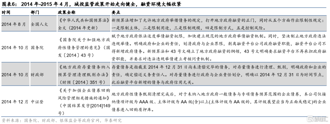2014年新预算法、国发43号文两个地方政府融资的纲领性文件颁布,城投平台监管政策开始健全,政企融资职能出现区分。新预算法允许地方政府举债,打开地方政府融资正门;43号文要求坚决制止地方政府违法违规举债,开启了政企分离的顶层设计,明确要求融资平台不再承担政府融资职能,并要求对违法违规举债建立考核问责机制;351号文对存量债务进行政府与企业责任划分,存量债务中政府有偿还义务的债务,在2015-2018年发行地方政府债券进行置换,以2014年12月31日为时间节点,此后融资平台新增的债务与政府信用无关。债券登记机构也发布了与之相匹配的政策,2014年12月底中证登通知,未纳入地方政府债务范围的企业债券,仅接纳债项评级AAA以上的企业债券纳入回购质押库。