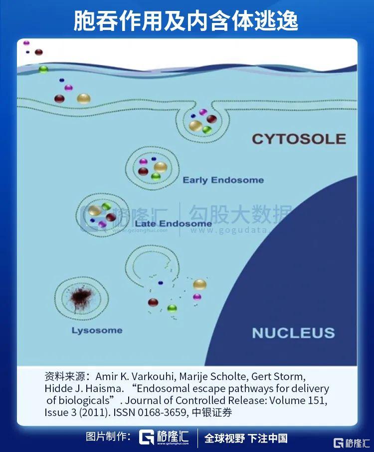 进入细胞质需要通过细胞膜,细胞膜由磷脂双分子层构成,磷脂分子头部具有亲水性,尾部具有疏水性,两层磷脂尾部相对形成双分子层,能够有效控制水分子、离子、大分子物质通过。mRNA作为大分子(300-5000kDa),在不破坏细胞膜的前提下,进出细胞只能以内含体(endosome)通过胞吞作用(endocytosis)。