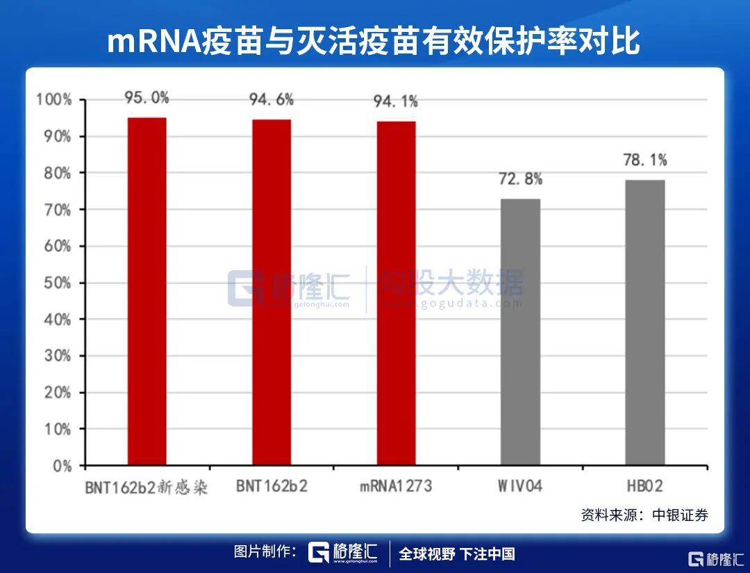 2020年11月18日,辉瑞发布了BNT162b2的III期临床试验结果,结果显示疫苗整体保护率高达95%。2021年3月31日,Moderna发布了mRNA-1273的III期临床试验结果,结果显示疫苗整体保护率也达到94.1%,与BNT162b2的数据非常接近。