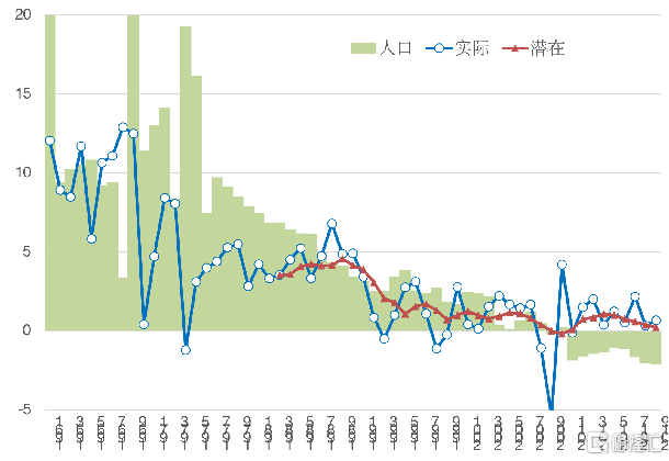 图15 日本人口净增长、实际与潜在经济增长率