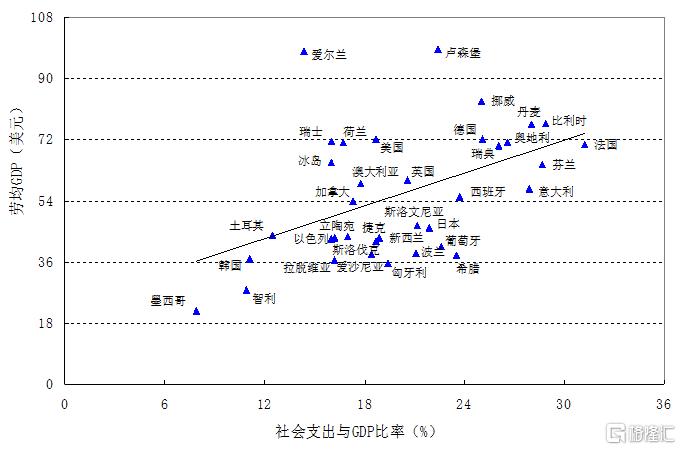 从过去的“效率优先”,到“兼顾公平”,再到后来的“公平与效率并重”,我们在考虑发展问题时往往把公平和效率作为此消彼长、不可兼得、需要在政策中进行权衡的两个目标。然而,我们可以参考一些福利国家的经验,如被称为“发达国家俱乐部”的经合组织(OECD)各成员国的发展状况。与我们过去设想的“高社会福利会降低人们的劳动积极性”不同,在这些国家中,劳均GDP与社会支出占GDP比重呈现高度正相关,即社会福利水平越高,劳动生产率越高。由此,我们需要对福利国家产生新的认识,对“北欧模式”进行重新思考。