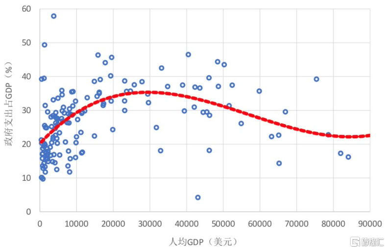 图24 各国政府支出占GDP比率与人均GDP水平的关系