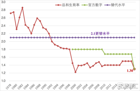 我国总和生育率的替代水平固定为2.1,从1992年开始,我国的总和生育率就低于这一水平,进入了低生育水平阶段,之后生育率仍在不断下降。2000年之后,学者估计的生育水平大体在1.4。近年来,根据中国官方提供的信息,联合国使用的统计数据约为1.7,由此可以认为官方的总和生育率为1.7,可见官方数据与学者研究间有较大差距。
