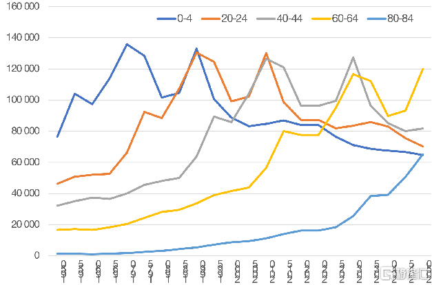 以日本为例,日本在2009年总人口到达峰值,之后便进入负增长阶段,连续十多年每年有几十万人口的绝对减少。从2015年到2019年短短四年间,日本的老龄人口就在迅速地增加,人口结构向高龄迅速地移动。(图8)