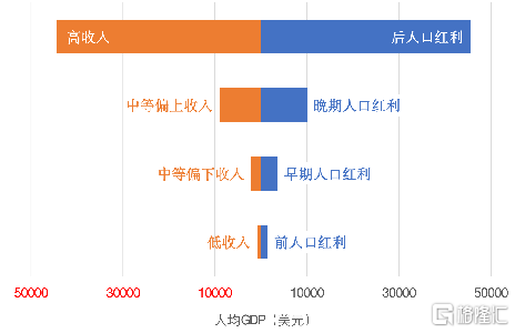 上述两种分组对应的人均GDP水平高度相关,大体上具有一一对应的关系,即低收入国家对应前人口红利阶段,中等偏下收入国家对应早期人口红利阶段,中等偏上收入国家对应晚期人口红利阶段,高收入国家对应后人口红利阶段。(图6)