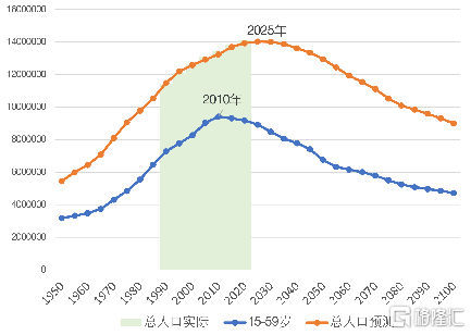 日本在1960年经历了刘易斯转折点,简单来说就是,劳动力短缺、工资上涨;中国在2004年经历同一个转折点,以民工荒为特征,此后劳动力成本不断上涨。20世纪90年代初期,日本经历了第一个人口转折点,即劳动年龄人口达到峰值并开始负增长,这一阶段对应于中国的2010年。日本的第二个人口转折点在2010年,即总人口达到峰值后进入负增长,这一阶段将对应于中国的2025年。