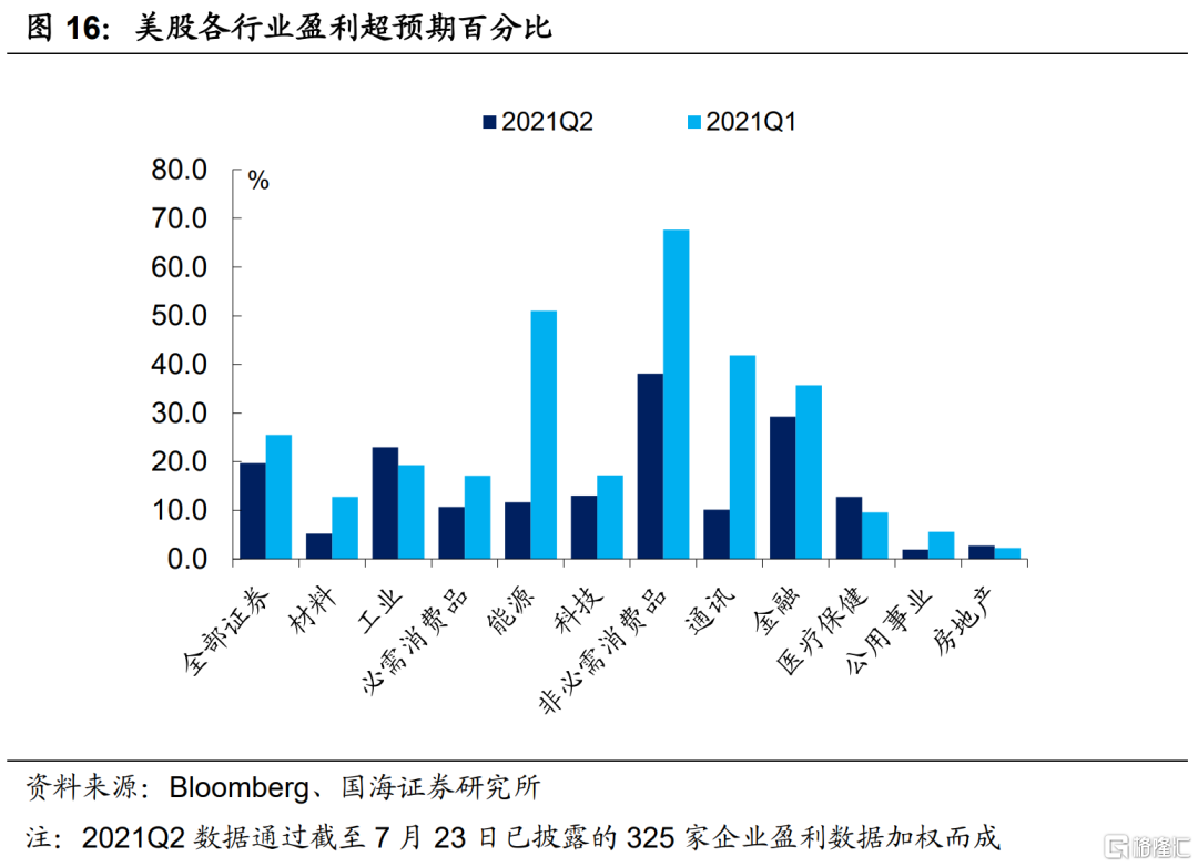 截至7月23日,根据目前已经披露的325家美国上市公司财报来看,二季度盈利表现依旧比较有韧性,超预期的盈利增长现象普遍存在。其中非必选消费板块表现依然强劲,这可能与3月份美国发放的第三轮财政刺激有关,未来几周将是在美上市企业二季报的密集披露期,预计超预期盈利情况仍将继续对美股产生一定支撑,在当下高估值的环境中,业绩惊喜能够继续为美股创造一定的时间和空间。