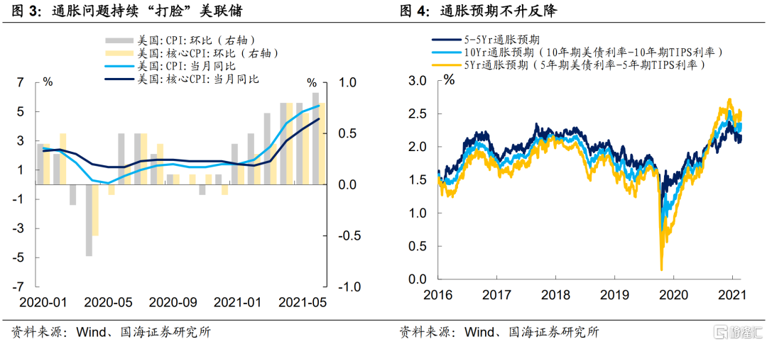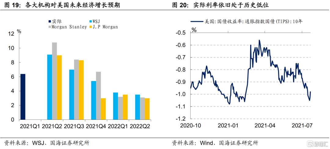 目前美国就业恢复缓慢,供给改善逻辑迟迟没有兑现,若通胀问题不能在短时间内“退烧”,那么美国将出现“滞涨”风险。我们在《美国通胀“高烧”何时降温》中指出,美国核心通胀开始发力。由于薪酬、房租具有一定价格粘性,短期内将继续高位运行,通胀可能在短时间内难以快速下行。在此格局下,一旦美国经济增速在三季度开始放缓,通胀的高位运行,将使美国有进入“滞涨”的风险,届时或将迫使美联储提早收紧货币政策,进而使得股市承受较大压力。