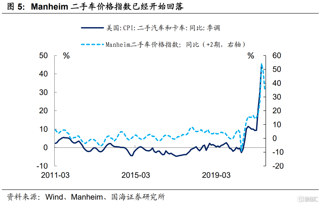 然而,居民部门对二手车需求弹性有限,从Manheim二手车价格指数来看,最新6月份的二手车价格已经开始回落,由于Manheim二手车价格指数领先CPI二手车价格同比2个月左右,预计未来二手车的“通胀”因素会逐渐消退。