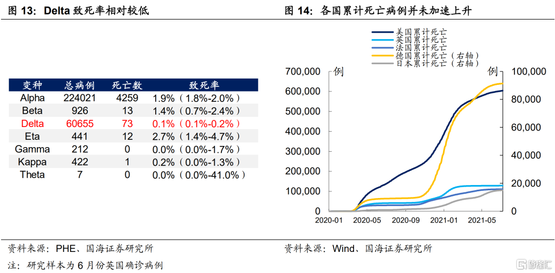 Delta毒株传染力高,但致死率不及传统Alpha毒株。根据目前已有的研究表明,在英国确诊的感染Delta毒株的病例中Delta毒株虽然传染性强,但是致死率不及传统的新冠病毒,这可能与当下各国普遍有一定疫苗接种基础有关。这一点从最近各国的累计死亡数上有所印证,美日欧的确诊都在增加,而死亡病例没有明显提速。