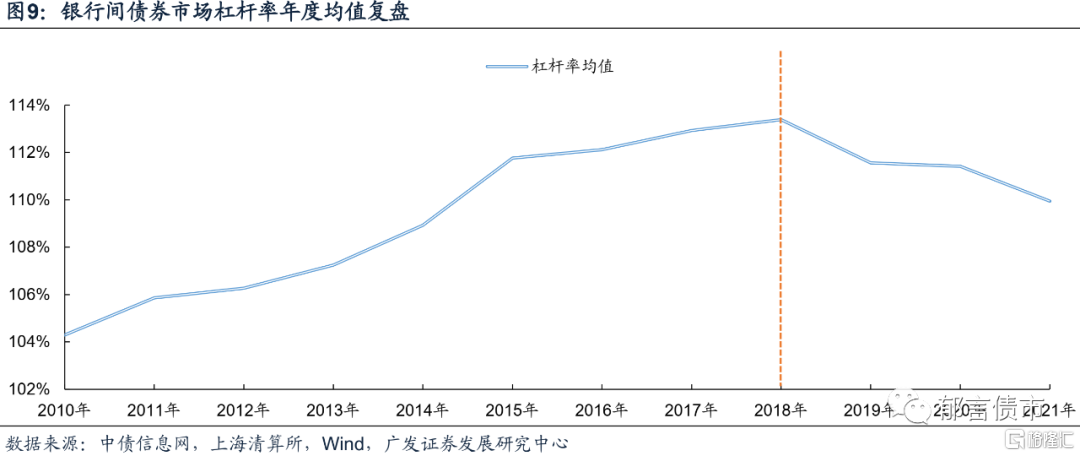 2018年4月,为了防范化解金融风险,促进金融体系健康及韧性,央行、银保监会、证监会、外汇局联合发布资管新规,重挫债市加杠杆热情,2018年也成为银行间债券市场杠杆的“分水岭”。2010年至2018年,银行间债券市场主要机构集体“加杠杆”以增厚收益,于2018年达到113.39%水平;2018年以来,银行间债券市场杠杆率的中枢下移,今年的平均杠杆率已降至109.95%。