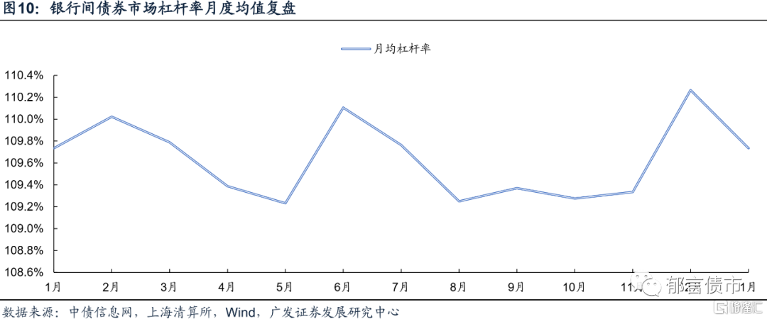 从月度均值复盘来看,银行间债券市场杠杆率经历3个峰值,分别为2月的110.02%、6月的110.11%、12月的110.27%,这三个月份均临近季度末。在峰值之后,银行间债券市场杠杆也经历了3个低谷,分别为5月的109.23%、8-11月109.30%的中枢水平、1月的109.73%。