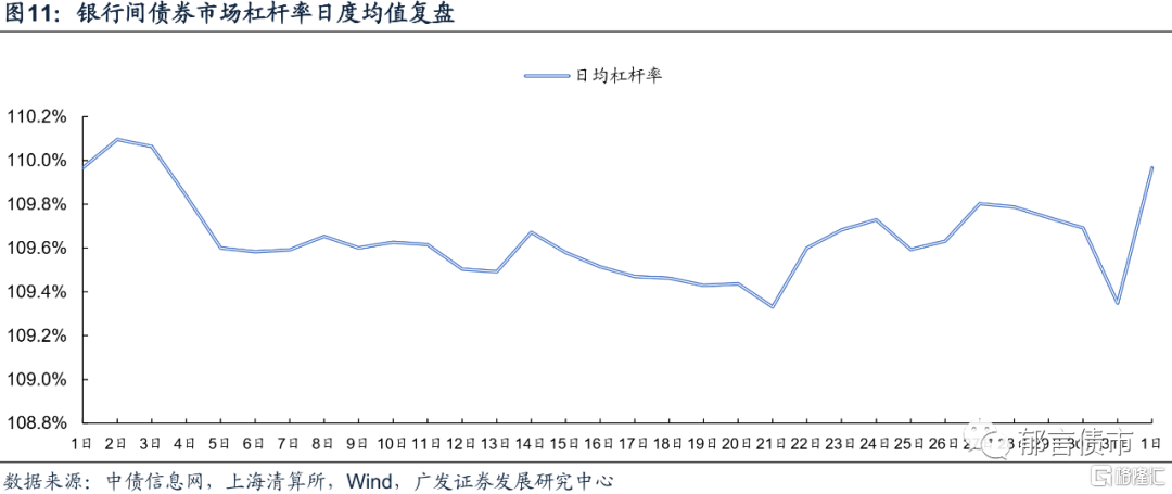 细节来看:(1)度过紧张的月末,月初资金面改善,银行间债券市场杠杆逐渐抬升至月内峰值110.10%。(2)随着月内资金面的波动,杠杆由峰值回调至中枢水平上下波动直至月中。(3)15日之后,受月中税期走款影响,主要机构纷纷调低杠杆。(4)步入下旬,税期走款压力逐渐散去,银行间债市杠杆一度加到109.80%。(5)受月末资金需求旺盛影响,杠杆率下降至月内低谷109.35%。