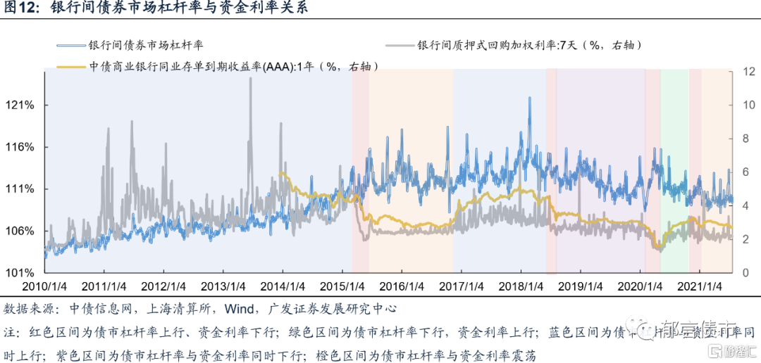 整体来看,银行间债券市场杠杆率与R007利率的相关系数为-0.16,与AAA同业存单收益率相关系数为-0.12,债市杠杆率与资金利率整体具有负相关性,即债市杠杆波动受资金价格因素制约。