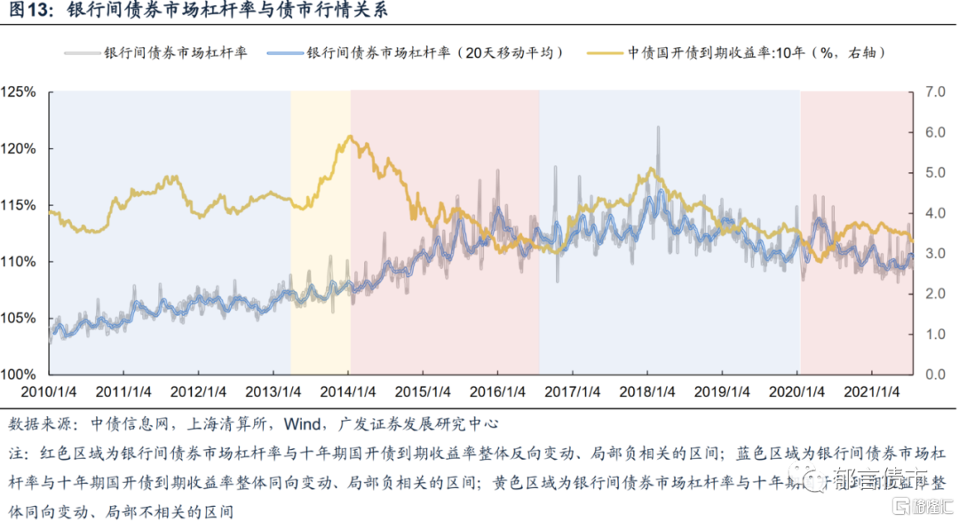 (5)2020年2月至今,整体上银行间债券市场杠杆率与十年期国开债到期收益率反向变动,杠杆调整的拐点与市场收益率拐点几乎同步。