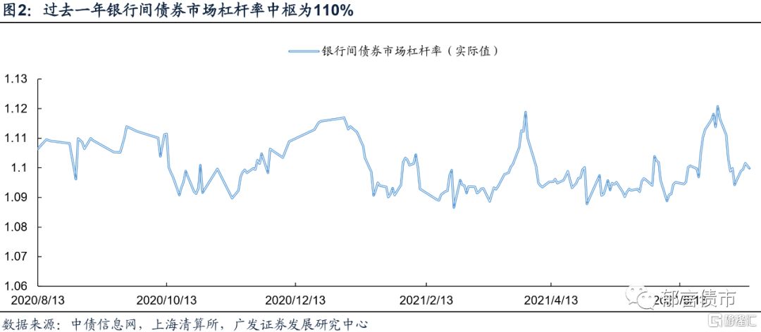 根据现有的日度质押式回购余额数据,结合上一步计算的债券托管日度总额与银行间债券市场杠杆率计算公式,我们只能将银行间债券市场杠杆率追溯到2020年8月。近1年来银行间债券市场杠杆在110%中枢水平上下波动。