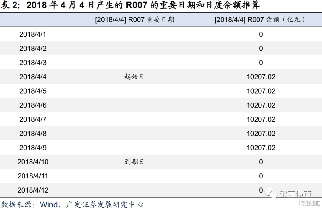 我们以2018年4月4日产生交易的R007为例,该笔银行间质押式回购交易于2018年4月4日产生,交易金额为10207.02亿元,平均回购期限为5.78天(进行四舍五入为6天)。因此起始日为2018年4月4日,到期日为2018年4月10日,期间该笔银行间质押式回购交易的余额均为10207.02亿元。