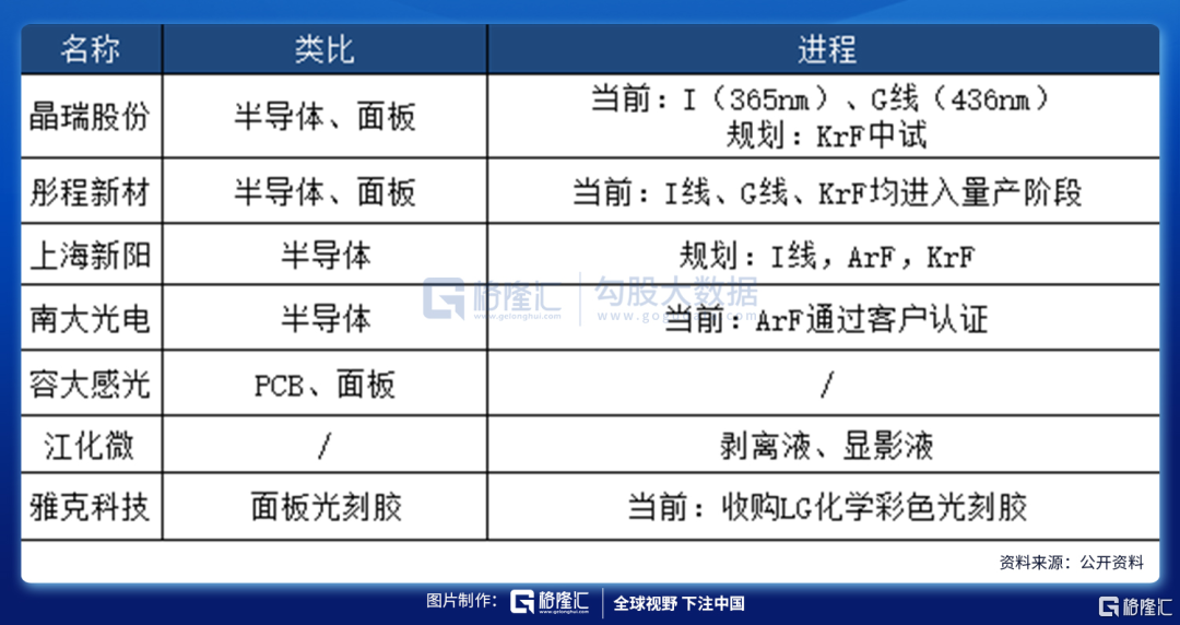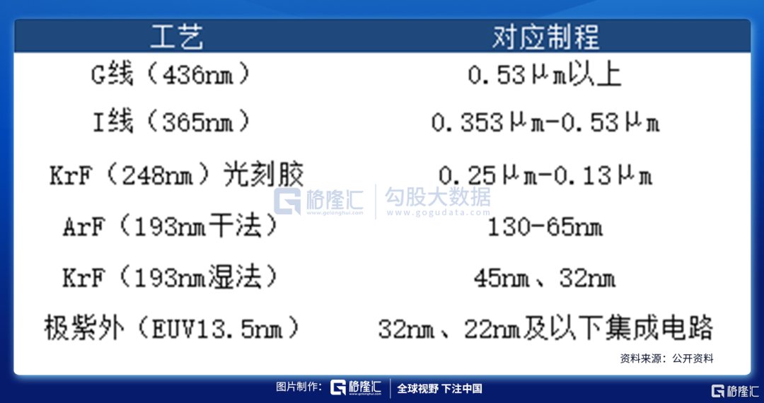 具体我们参照一下下面这个表,A股上市公司主要是在I线、G线、KrF以及ArF制程上开始落地。