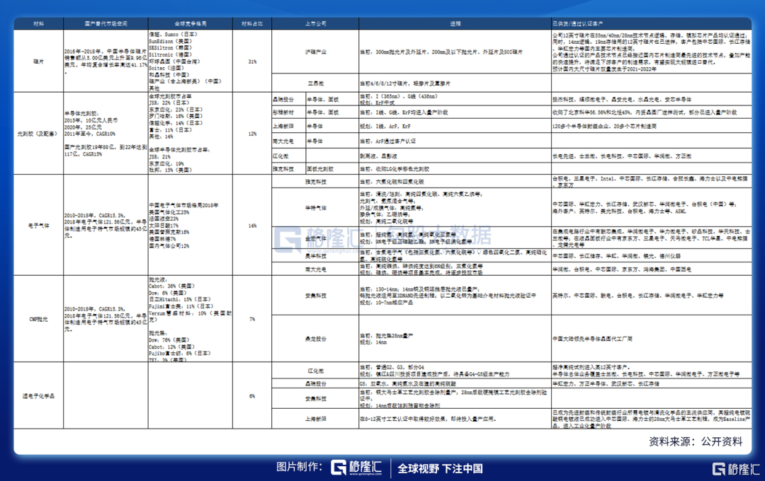 而光刻胶板块的爆发,也将引起其他材料的机会,其他的材料在半导体制造中也同样中游,缺少了任一种材料或设备都将影响半导体的制造。需要强调的是在CMP抛光材料领域,国内的企业安集科技(抛光液,14nm已经量产,正在研发10-7nm)和鼎龙股份(抛光垫,28nm量产,研发14nm)这两家企业在制程上是走得最远的,基本能覆盖10nm以上所有的制程。也就是说,只要这两家有足够的产能,基本都能被国内的晶圆厂消化掉。