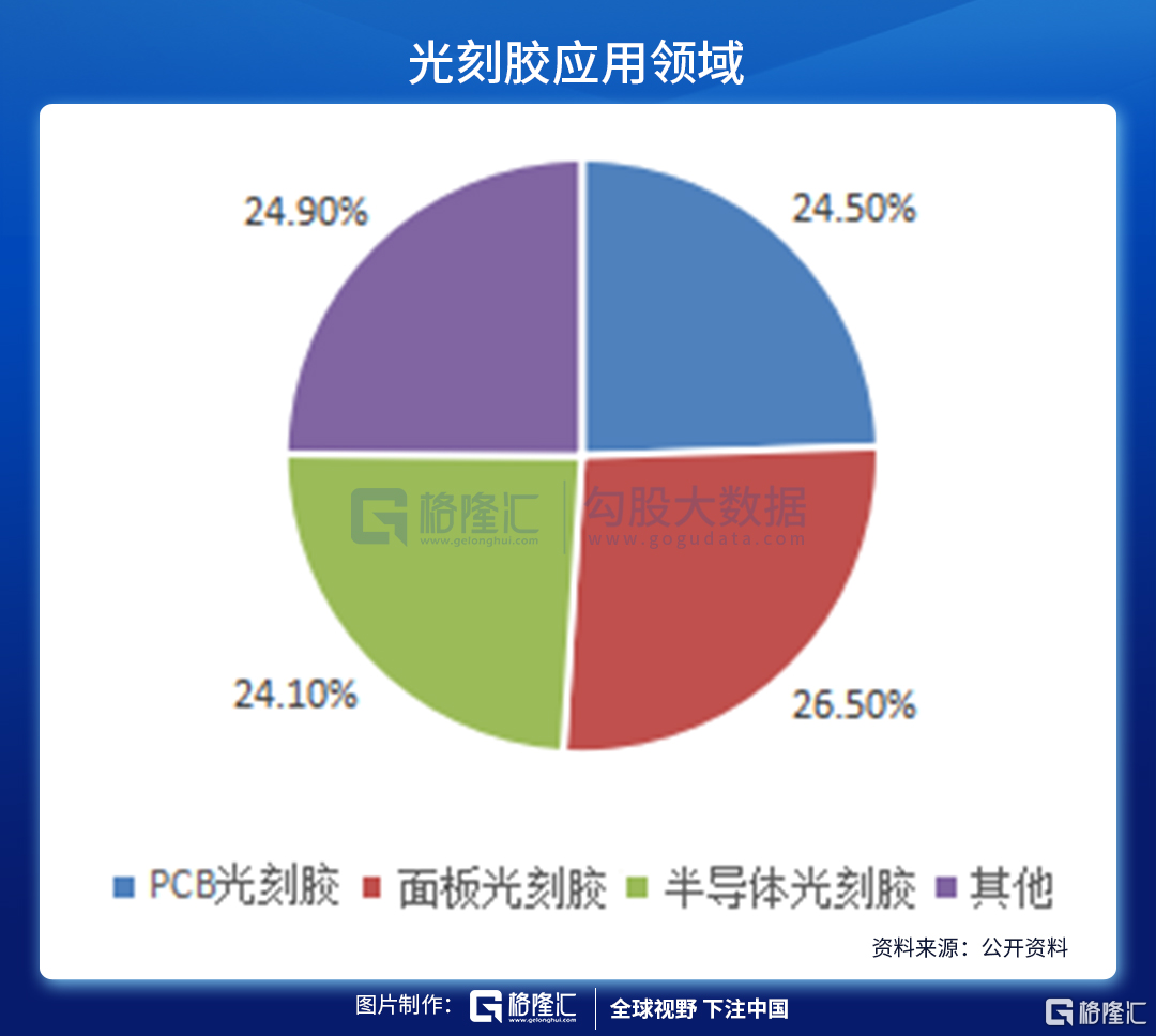 光刻胶分为PCB光刻胶、面板光刻胶和半导体光刻胶,我们平常在说半导体制造中需要配合配合光刻机使用的,是其中的半导体光刻胶,这三种主要的光刻胶分别占约1/4。