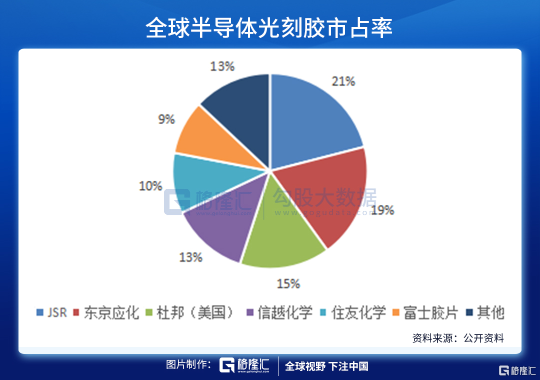目前全球半导体光刻胶基本被日韩垄断,美国的杜邦约占15%的份额,剩下的基本都是日本企业,中国在里面的占比极低,离全球领先企业还有明显的距离。