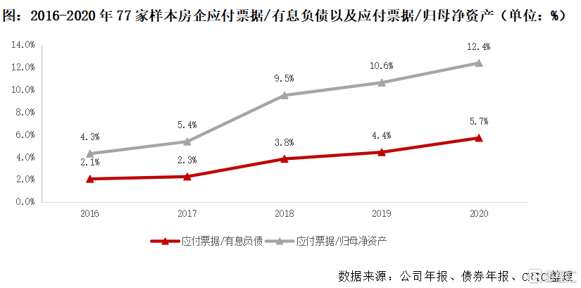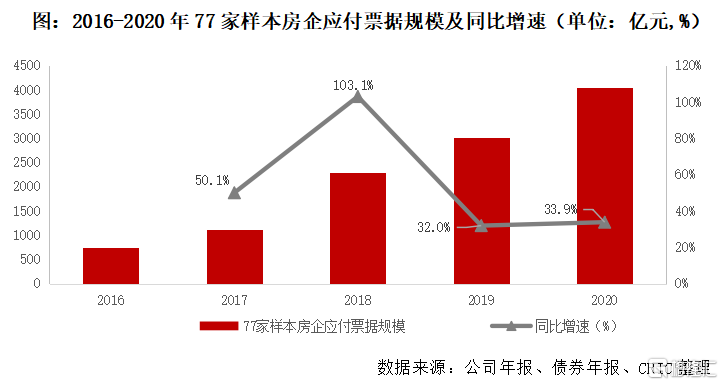 从绝对值来看,77家样本房企应付票据规模从2016年750.74亿元增长至2020年的4040.95亿元,复合增速52.3%,历年增速均维持在30%以上