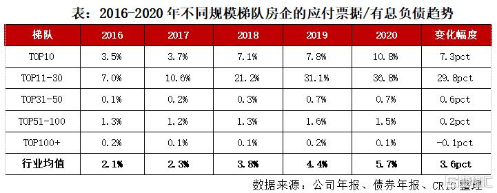 趋势变化上,除TOP100+房企外,其余梯队房企对商票依赖度逐年提升,其中商票融资依赖度提升最快的还是TOP30房企,2020年末TOP11-30和TOP10房企应付票据/有息负债分别较2016年提升29.8pct和7.3pct。未来商票纳入“三条红线”监管范围内,对高杠杆的头部房企而言,后续商票承兑和融资压力相对较大。