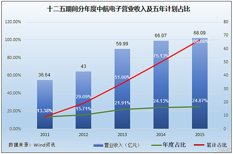 在十二五计划的这五年里,中航电子的收入基本遵循着前三年一半,后两年一半的规则。五年计划的第三年也就是2013年收入快速上了一个台阶,前三年累计收入占比是51%,后两年收入占到49%左右,后两年的收入差距不大。