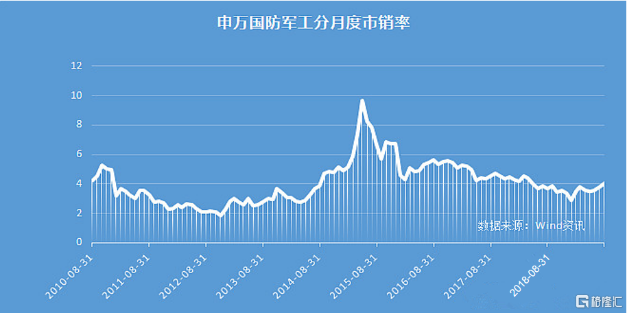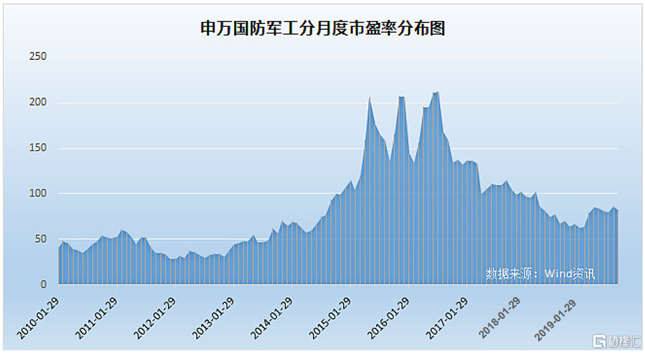 老的军工研究员,自己会总结出一个看市盈率炒军工股的规律,从2010年以来的市盈率走势看,军工行业的市盈率在50倍以下时,就可以配置,当市盈率超过100倍以上时,可以放弃。当然这个门槛在2015-2017年之间被提到100、200。这个规律的核心逻辑就是估值回归,假设军工行业将来会重复过去的估值。