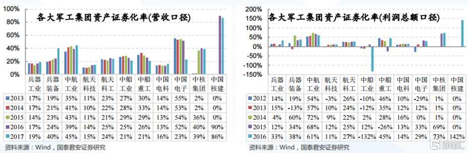 军工行业个股的投资还是主要看外延,也就是资产注入。根据国泰君安军工研究小组的数据,各大军工集团的资产证券化率都不高,从利润的角度看,航天科技和航天科工集团上市公司的利润体量都不到集团的30%,集团内部还有相当大数量的优质资产没有注入上市公司,这些都值得资本市场去想象,也是主题投资的主要逻辑支撑。