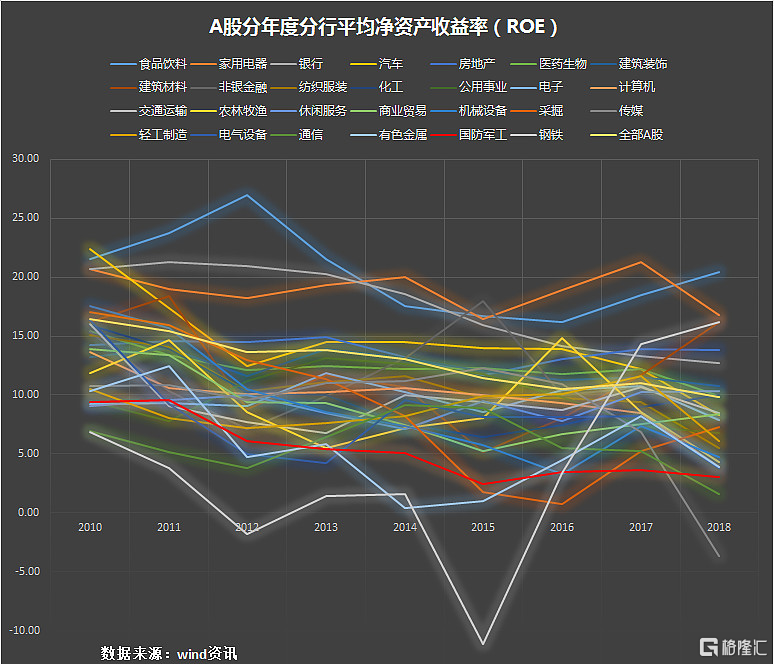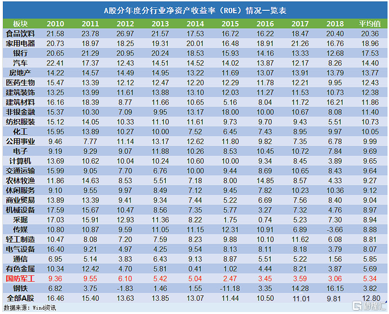 我们的国防军工呢?从多年的平均值看,排名倒数第二,倒数第一是钢铁,但钢铁因为有周期性,部分年份出现了负的ROE,属于情有可原。