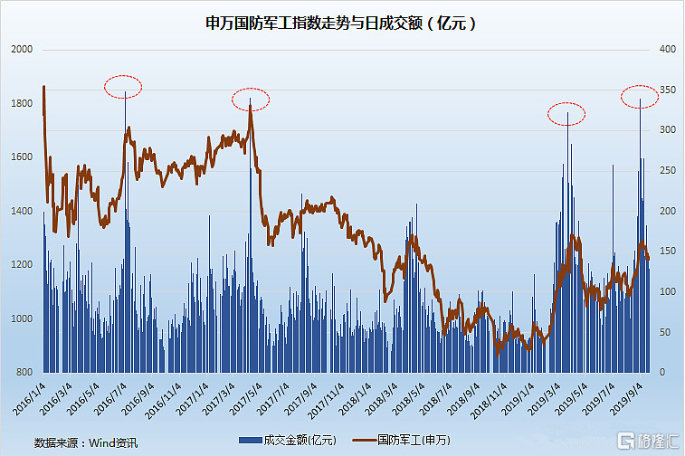 如上图,从2016年到2019年9月,军工行业总共有四次成交额上300亿,第一次是2016年7月5日,第二次是2017年4月11日,第三次是2019年3月25日,最近的一次是2019年9月3日。从历史规律看,最近这几年,每当申万国防军工指数的成交额冲上300亿之后,事后看都是短期的一个高点。
