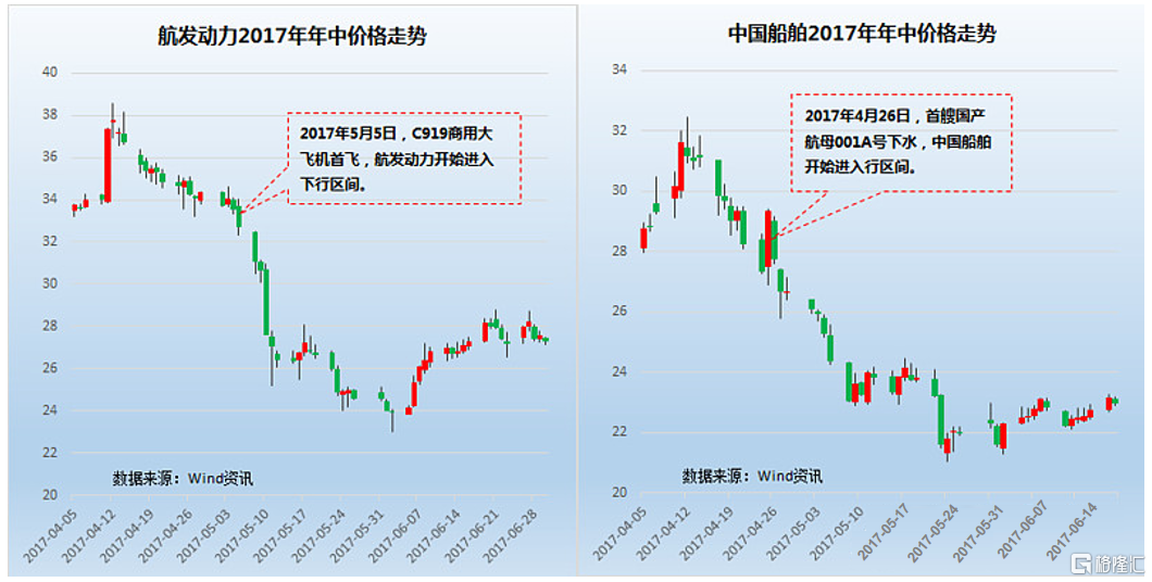第二个,2017年5月5日,大飞机C919首飞,大飞机概念股航发动力也在当天开始了一路下行。