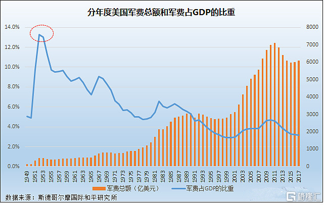 这是美国分年度军费总额和军费占GDP的比重。在1949年之后,真正让美国重视起来的是朝鲜战争,当时军费占到美国GDP的13.3%(1952)。