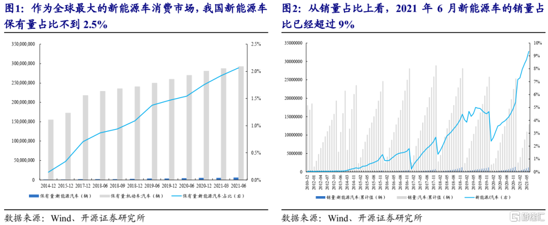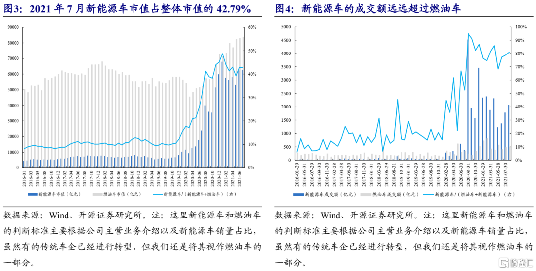 (1)从新能源的主要下游新能源车与传统燃油车的对比来看:目前新能源车的静态渗透率并不高,作为全球最大的新能源车消费市场,我国新能源车保有量占比不到2.5%;但渗透的速度较快,从新增销量占比的角度来看,2021年6月新能源车的销量占所有汽车的比例已经超过9%。即便如此,2021年7月全球与新能源车相关的主要上市公司市值占整体市值达到了42.79%,远远高于渗透率;成交额更是远远超过了燃油车。上述测算还只是一个保守估计,因为有很多燃油车其实已经开始向新能源车转型,这足以说明资本市场对于新能源车的追捧和很高的期许。