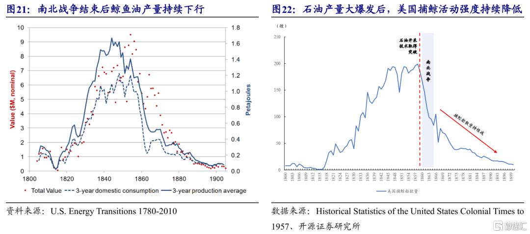 这一现象其实并不令人费解,鲸鱼油价格上行背后有三大原因。首先,煤油早期的生产成本并不低。在1858年以前,煤油的生产主要通过加斯纳加热煤炭的方法进行。但是,通过对煤炭进行加热、蒸馏来提取煤油的方法不仅效率低,而且要支付专利费,使得煤油相对鲸鱼油的价格优势并不明显。其次,随着鲸鱼数量的减少,捕鲸成本不断提升。从事捕鲸相关工作的水手需要乘坐更大的捕鲸船,到更远的海域才能捕捉到鲸鱼。同期捕鲸舰队数量开始减少,行业的集中与成本的上升推升鲸鱼油价格的上升。第三,南北战争严重影响捕鲸事业。1861美国南北战争爆发,由于南方联盟国对北方的捕鲸船进行袭击,使得这一时期的捕鲸活动大幅收缩,进而引起鲸鱼油供给的大幅降低。在这三个因素的共同作用下,鲸鱼油的价格在1865年前后时达到历史最高值。