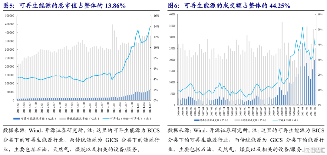 (2)从新能源的中上游可再生能源和传统石化能源(这里主要包括石油、天然气和煤炭)的对比来看:截至2018年全球可再生能源的消费量占比不足7%,而2018年可再生能源的总市值占整体的比值也没有超过7%,成交额占比不足20%;但2020年以来可再生能源的总市值与成交额迅速攀升,截至2021年7月总市值占整体市值的13.86%,成交额占比为44.25%,这与可再生能源产业迅速发展以及全球各国陆续宣布碳中和政策规划(尤其是我国)给资本市场带来的期望不无关联。