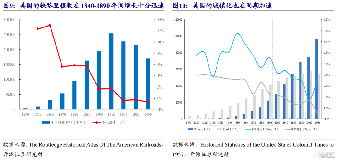 (1)蒸汽机车的发明与应用替代了马匹在长途运输中的作用,同时也伴随了城镇化的加速。在19世纪中期,由于运力和运输距离的优越性,蒸汽机车先在长途运输方面逐步替代马匹,在这个期间我们观察到美国的铁路里程数在1840-1890年间增长十分迅速,与此同时我们观察到了美国城镇化也在加速。