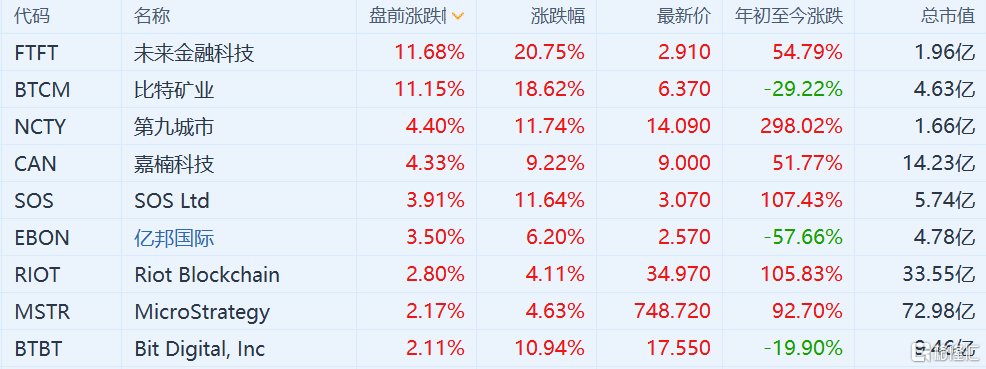 美股区块链股盘前集体大涨 比特矿业涨超11%