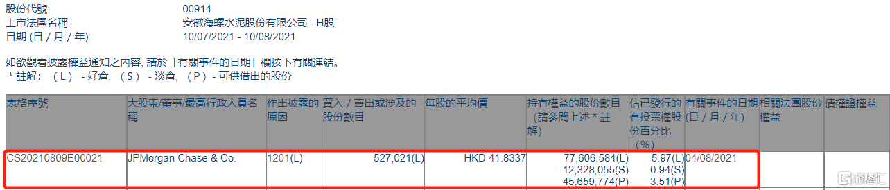格隆汇APP获悉,根据联交所最新权益披露资料显示,2021年8月4日,海螺水泥(00914.HK)遭JPMorgan Chase & Co.以每股均价41.8337港元减持好仓52.7万股,涉资约2204.72万港元。