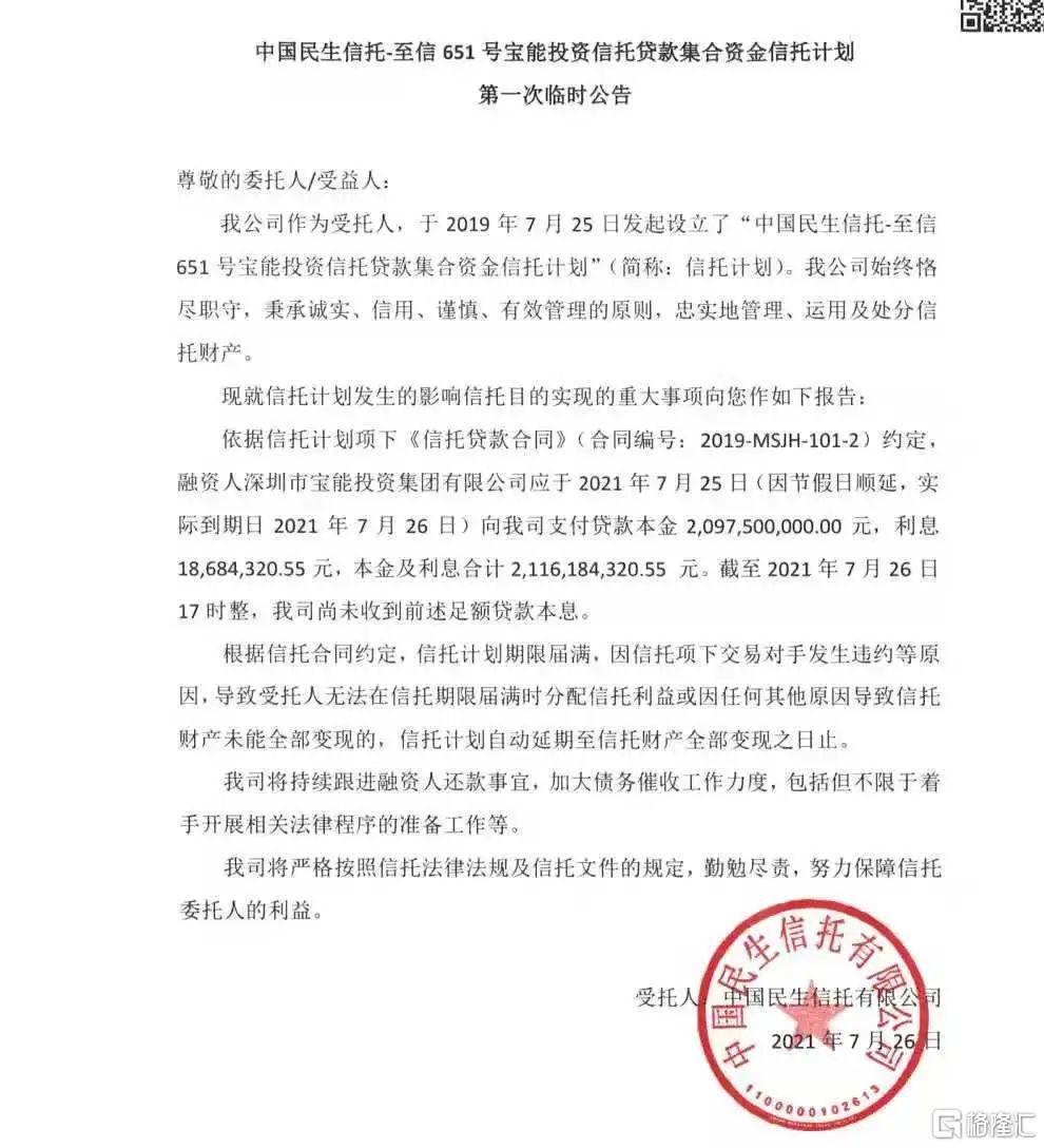 近日有媒体报道,民生信托于7月26日发布公告称“民生信托·至信651号宝能投资信托贷款集合资金信托计划”,因宝能未能及时付款而逾期。