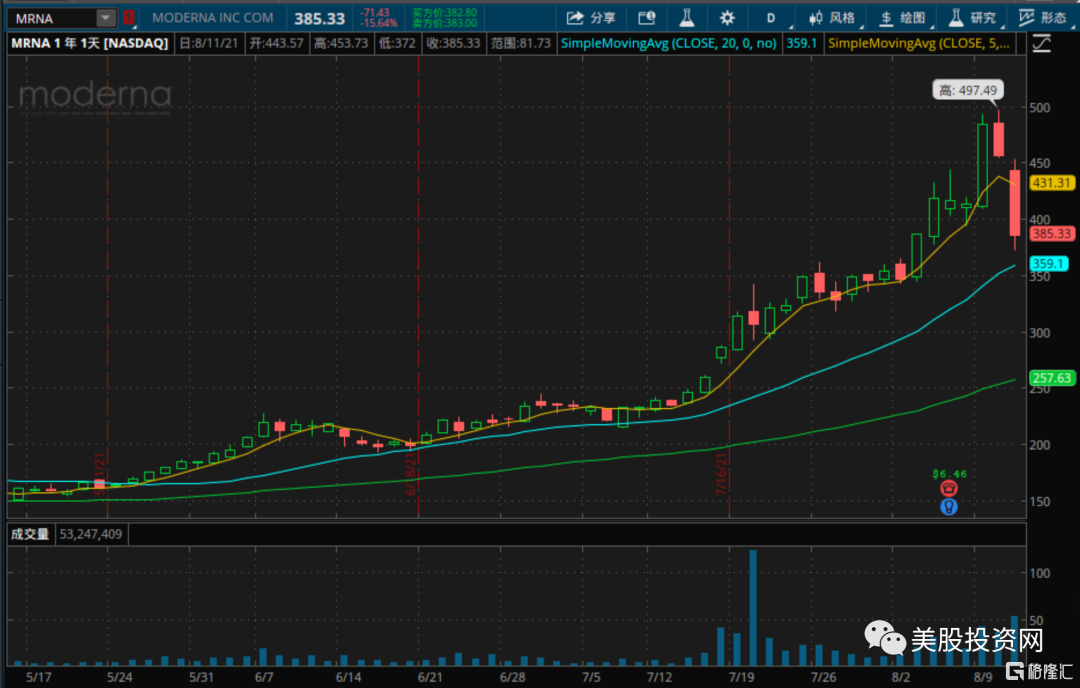 Moderna 股票代号 MRNA 大跌 16%,原因是美国银行(BAC)周二在一份报告中表示,Moderna今年累计上涨365%的惊人涨幅,从基本面看是不合理的。