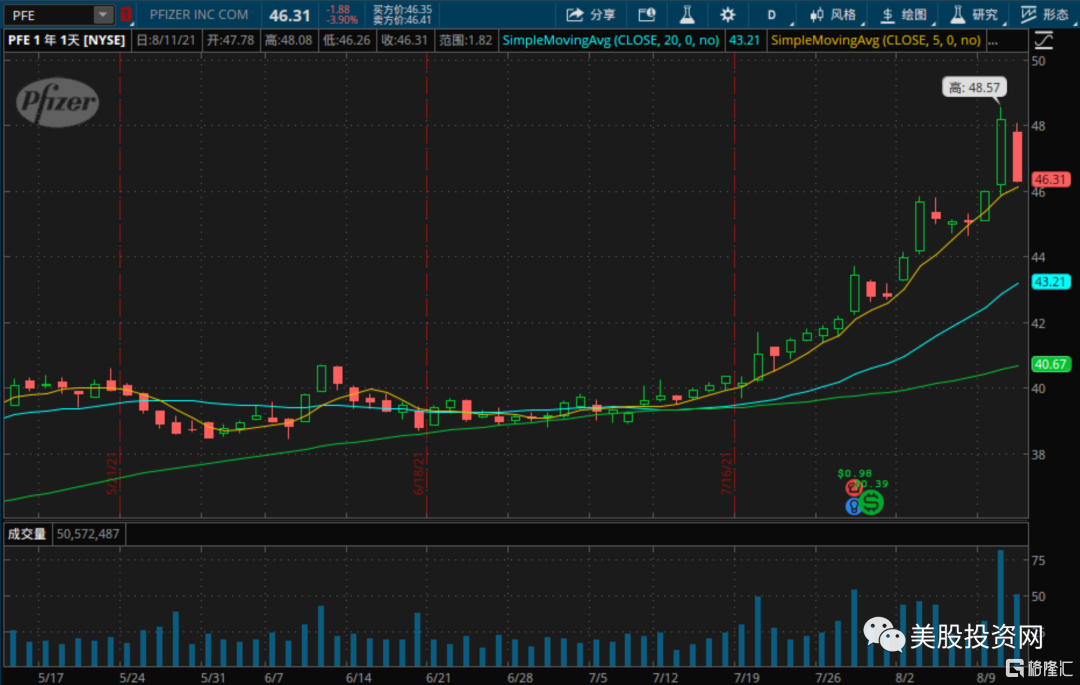 Moderna并不是唯一一家因新冠疫苗的成功而大幅上涨的股票。今年以来,BioNTech代号 BNTX 股价上涨了415%,目前市值超过1100亿美元。辉瑞 PFE 也出现10%的短期涨幅。