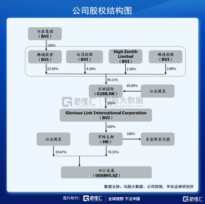 至于万洲国际,正是万隆所控制的公司。之所以这么说,是因为万洲国际的唯一股东和实控人是兴泰集团,持股34.11%。