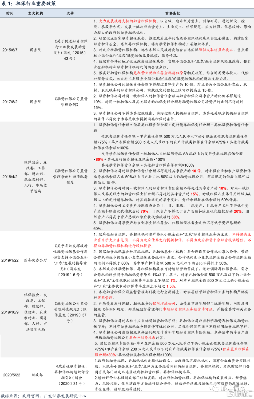 2019年1月,国务院办公厅发布《关于有效发挥政府性融资担保基金作用切实支持小微企业和“三农”发展的指导意见》,要求政府性融资担保机构“确保支小支农担保业务占比达到80%以上”,并提出“四个不得”:不得偏离主业盲目扩大业务范围,不得为政府债券发行提供担保,不得为政府融资平台融资提供增信,不得向非融资担保机构进行股权投资。2020年5月,财政部发布《政府性融资担保、再担保机构绩效评价指引》,明确了政府性融资担保机构的定义,由省级财政部门确定本地区政府性融资担保机构名单。