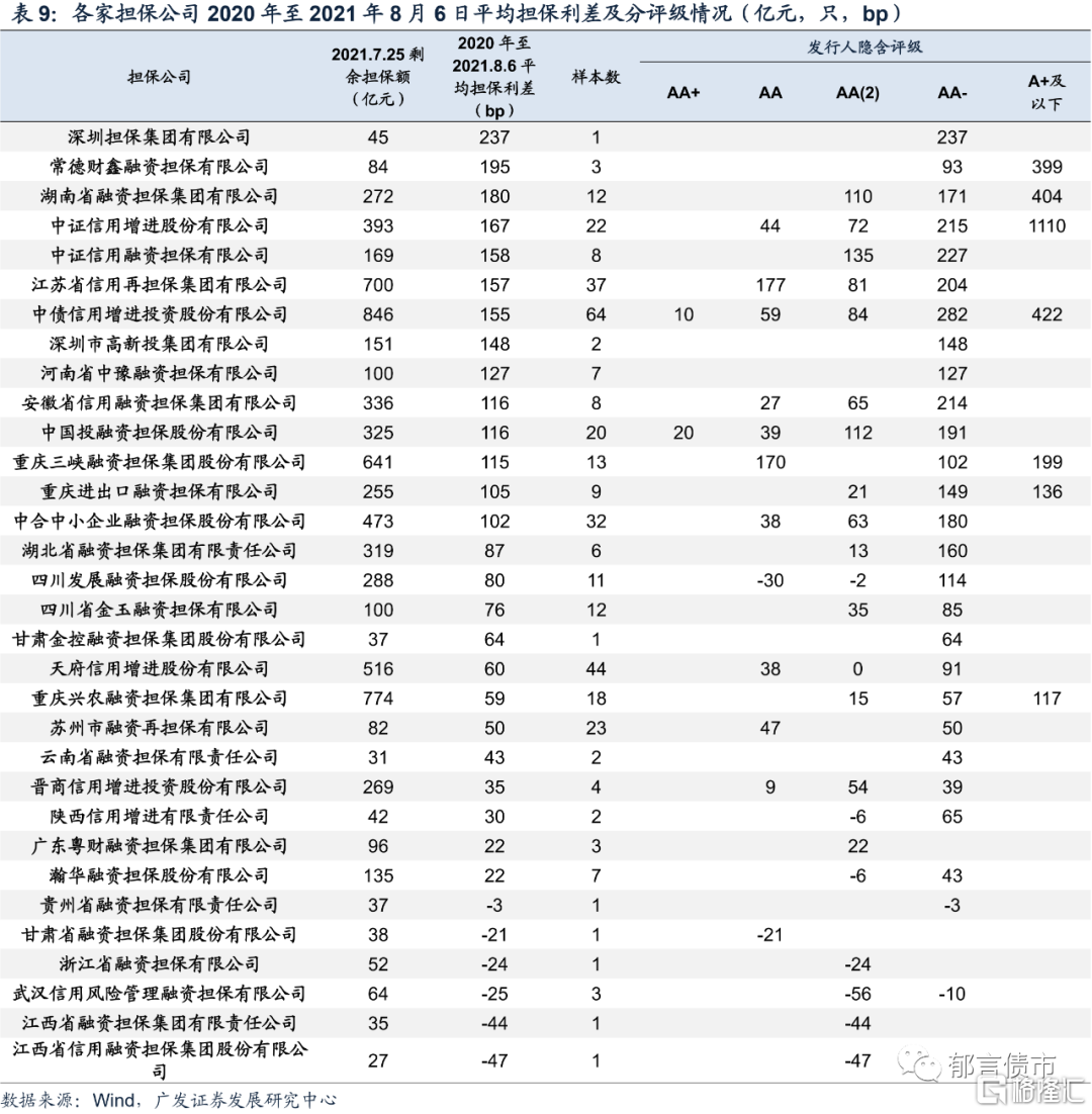 我们计算2020年至2021年8月6日各家担保公司的平均担保利差以及分评级担保债的平均担保利差。地方性担保公司中,常德财鑫担保、湖南担保分别由于担保弱资质的郴州市新天投资、株洲循环经济,拉高整体的担保利差水平。江苏再担保平均担保利差也较高,为157bp。对于AA-隐含评级的发行人,深圳担保、安徽担保和江苏再担保的平均担保利差超过200bp,湖南担保和湖北担保平均担保利差也较高,而贵州担保、武汉信用担保利差为负。