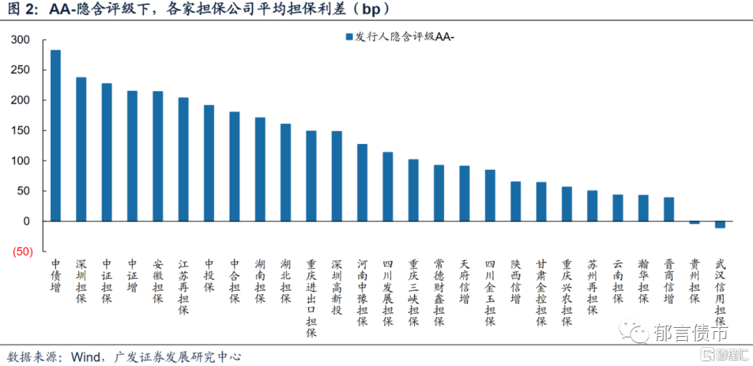 全国性担保公司中,中债增和中证增担保的主体资质整体较强,而中合担保和瀚华担保担保的主体资质较弱。对于AA-隐含评级的发行人,中债增平均担保利差最高,其次是中证担保和中证增,瀚华担保平均担保利差较低。