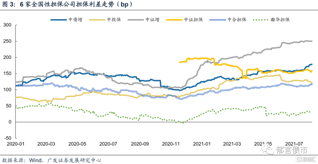 全国性担保公司的担保债样本相对较多,曲线较为平滑。2020年11月以来,中证增受弱资质样本吉林城建的影响,担保利差上升幅度最大,目前在250bp左右。中债增的担保利差呈现上升趋势,7月下旬以来涨幅扩大,一定程度反映了市场对其担保效力认可度的提高。中证担保处于业务扩张期,担保利差变化相对较大,目前担保利差中枢在150-160bp左右。2020年12月至2021年5月,中合担保的担保利差也呈现上升趋势,6月评级展望被调整为负面之后,担保利差小幅下降5-10bp。瀚华担保的担保利差水平相对较低,目前担保利差中枢在25bp左右。