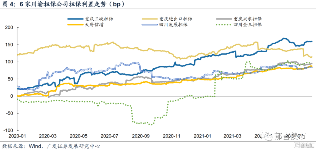 川渝6家担保公司中,重庆三峡担保的担保利差序列受样本扰动较为明显,曲线多次跳升或下降,整体呈现稳中有升的趋势,目前担保利差处于150-160bp左右。重庆进出口担保的样本相对较少,弱资质担保主体较多,担保利差也相对较高。2020年11月以来,四川发展担保、天府信增、重庆兴农担保的担保利差走势较为接近,目前担保利差在80-90bp左右。